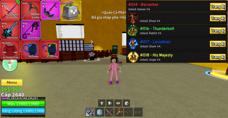 nổi bật: song đao , lưỡi hái , skull guitar , mỏ neo , áo choàng lễ hội , 1 trái vv , 5 tộc V4