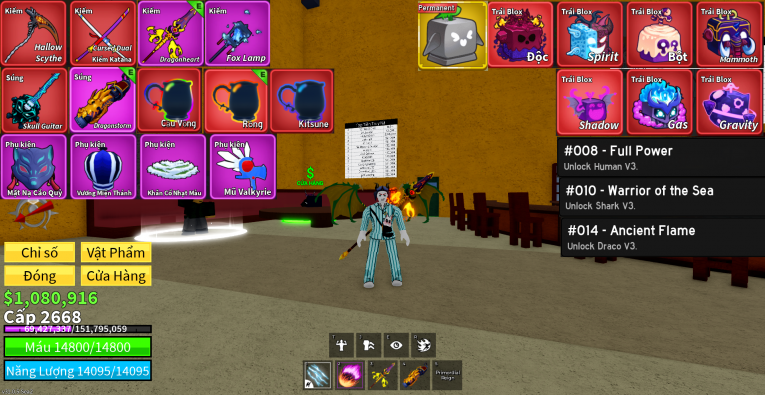 nổi bật: song đao , lưỡi hái , skull guitar , dragonheart , dragonstorm , 1 trái vv , 7 trái đỏ , draco v3 , cá v3 , người v3
