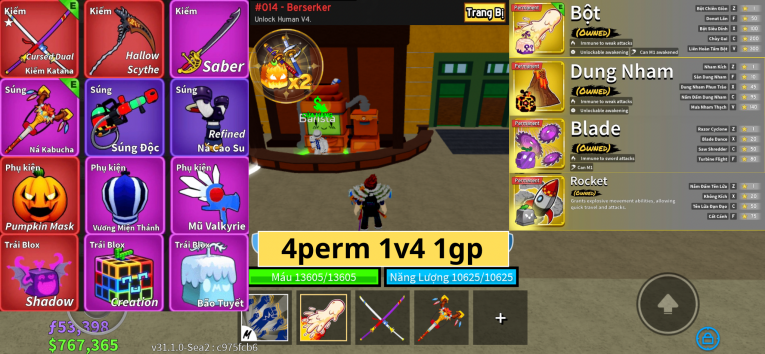 Acc có 4 trái vĩnh viễn 1 gamepass Acc có 1 tộc v4 item ổn