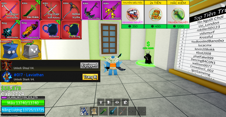nổi bật: yoru , song đao , tam bảo kiếm , lưỡi hái , skull guitar , mỏ neo , 3 gamepass , 2 trái vv , quỷ v4 , cá v4 , 3 tộc v3