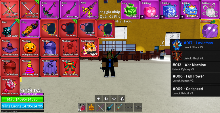nổi bật: song đao , tam bảo kiếm , skull guitar , mỏ neo , 9 phụ kiện đỏ , 1 trái vv , 2 slot trái , cá v4 , quỷ v4 , 3 tộc v3