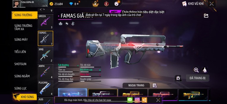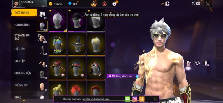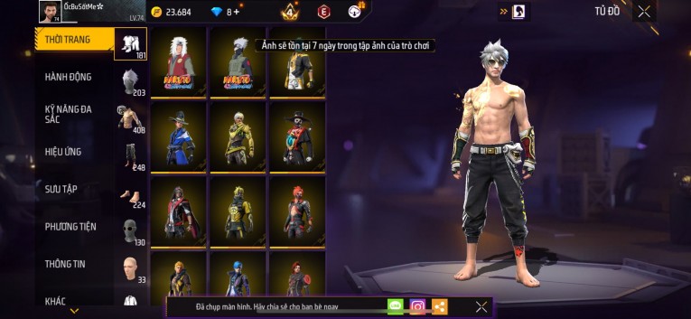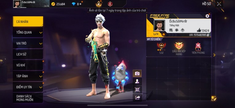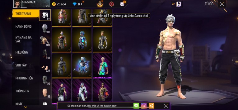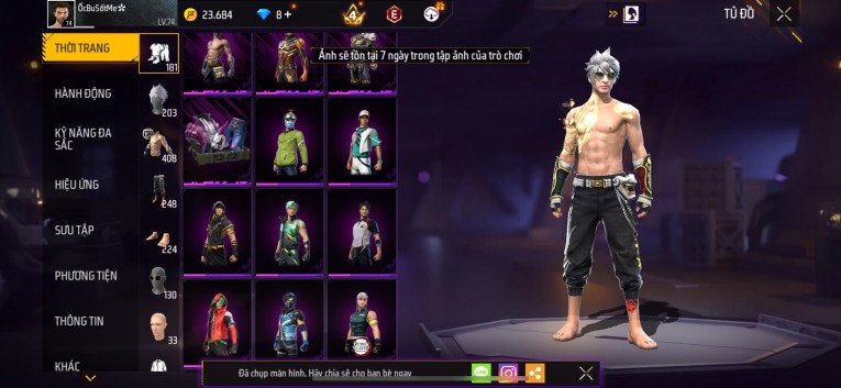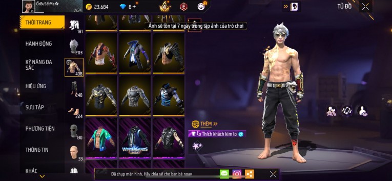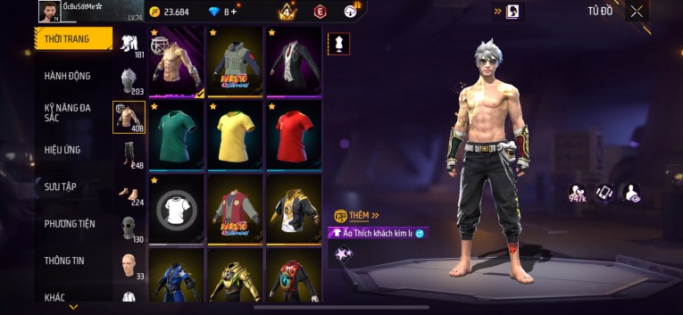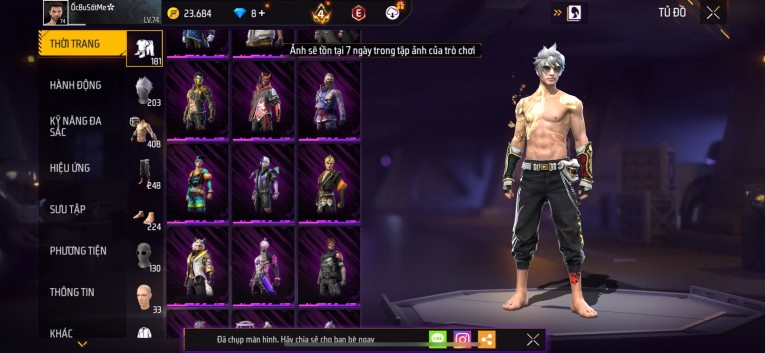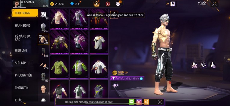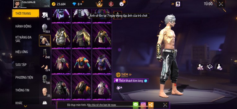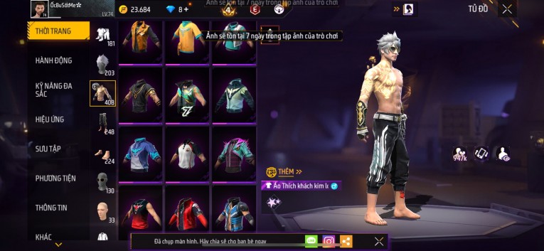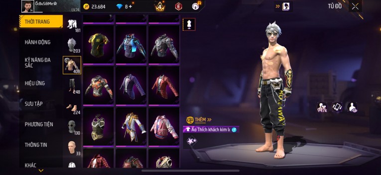 Acc chơi lâu, nhiều skin súng xịn, đầy đủ áo và phụ kiện nam. Đồ đủ dùng, đẹp mắt – vào chơi là chiến ngay! Phù hợp anh em thích skin đẹp, súng mạnh, acc ổn định.