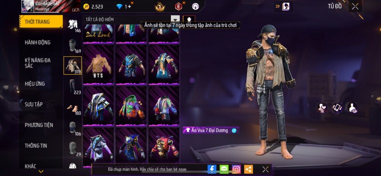 Acc chơi lâu, nhiều skin súng xịn, đầy đủ áo và phụ kiện nam. Đồ đủ dùng, đẹp mắt – vào chơi là chiến ngay!
